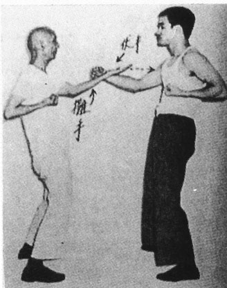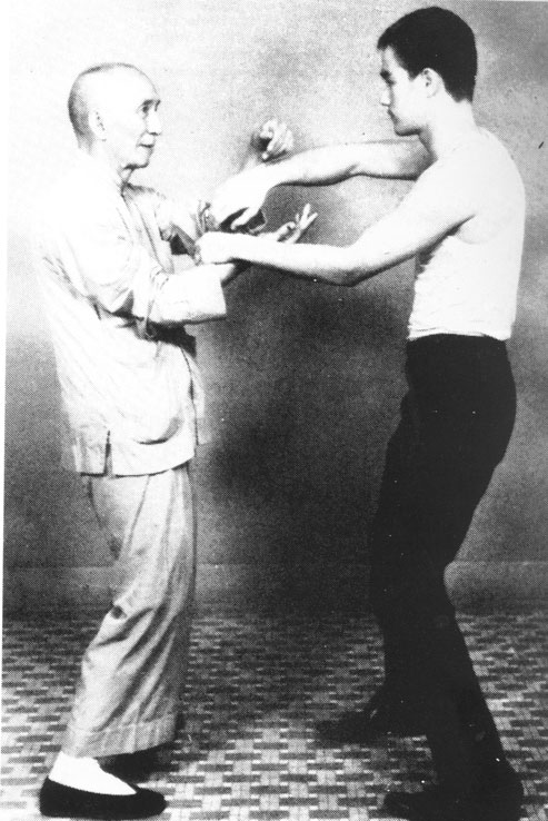 | Bruce Lee und Yip Man beim Poon Sao, des wichtigsten WT-Programmes. So kann reflexartig gekämpft werden. |