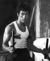 Bruce Lee zeigte oft Escrima in seinen Filmen, hier mit den Nunchakus und den Doppelstöcken.